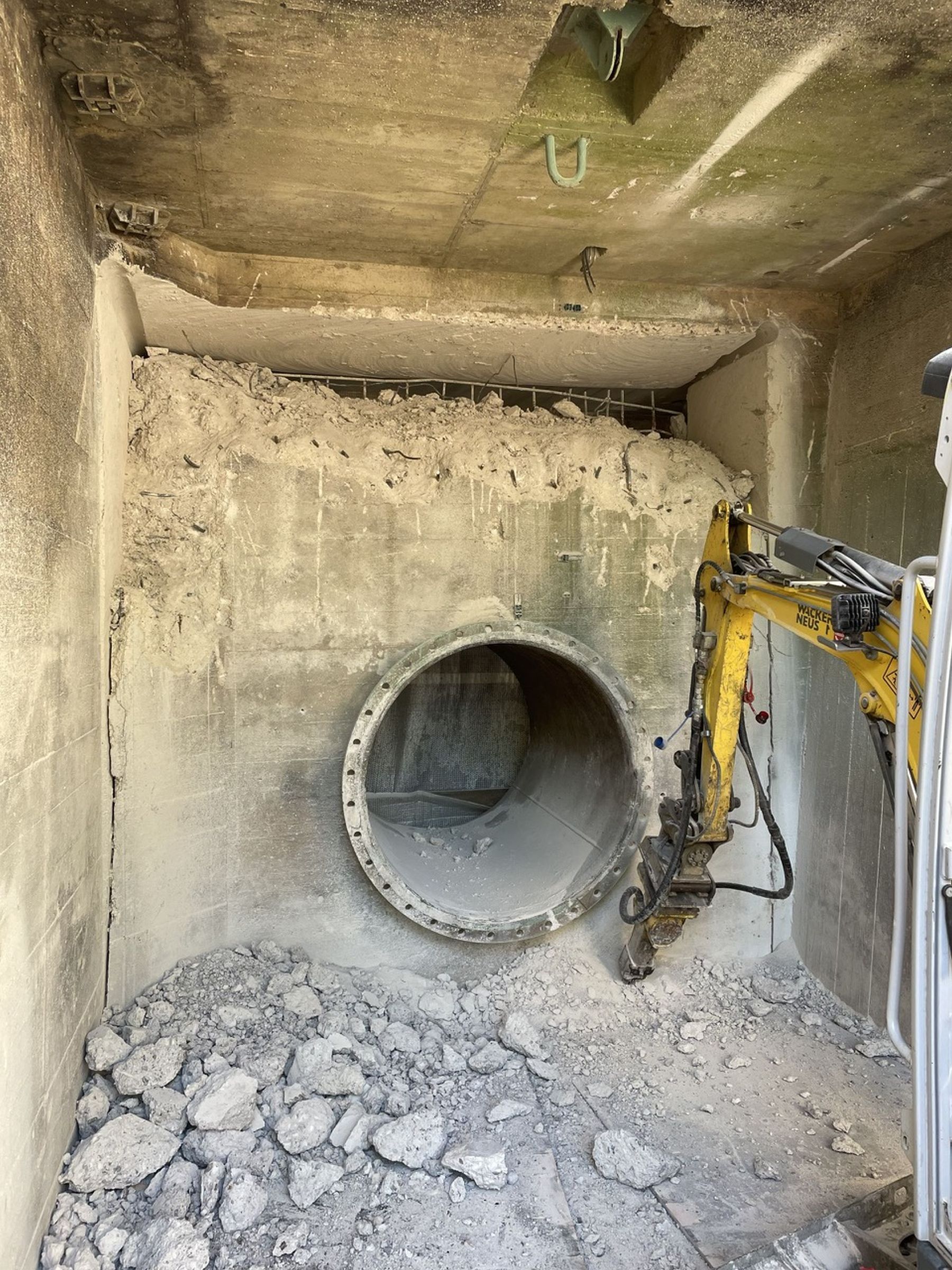 Nach dem Ausbau des Kegelstrahlschiebers aus seiner Öffnung musste die gesamte Wand aufgestemmt werden, um Platz zu schaffen für den Ausbau der alten Rohrleitung. Foto: Wasserwirtschaftsamt Traunstein