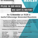 Pflege in der Krise-wie geht es weiter? So lautet das Motto eines hochkarätig besetzten Infoabends, der am Dienstag, 12.November um 19.30 Uhr im Gasthof Höhensteiger in Westerndorf/Rosenheim stattfindet. Ehrengast wird der Pflegebeauftragte der Staatsregierung, MdL Thomas Zöller (FW) sein, weitere Teilnehmer der Podiumsdiskussion werden sein: