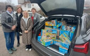 Mit vielen Schachteln des begehrten Spielzeuges rund um einen Bauernhof überraschen die Bäuerinnen den Pittenharter Kindergarten von links: Ortsbäuerin Manuela Graf-Maier, Stellvertreterin Marina Vodermaier, Daniela Schartner und Vroni Huber