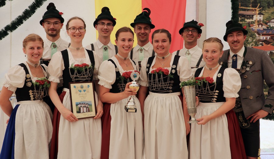 Sieger Aktivengruppe: vlnr 1. Gaudirndlvertreterin Johanna Wagner, die Siegergruppe Hebertsfelden I, 1. Gauvorplattler Sepp Bauer