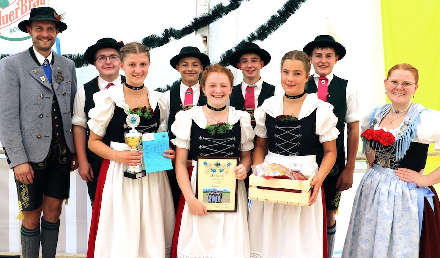 Sieger Jugendgruppe: vlnr 2. Gauvorplattler Rupert Treml, die Siegergruppe aus Emmering, 2. Gaudirndlvertreterin Kathrin Brem