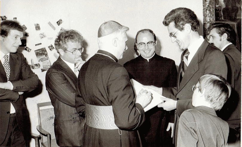 - v.l.: Erzbischof Joseph Ratzinger, Zweiter Bürgermeister Lorenz Kollmannsberger und Pfarrer Huber beim Firmungs-Empfang.