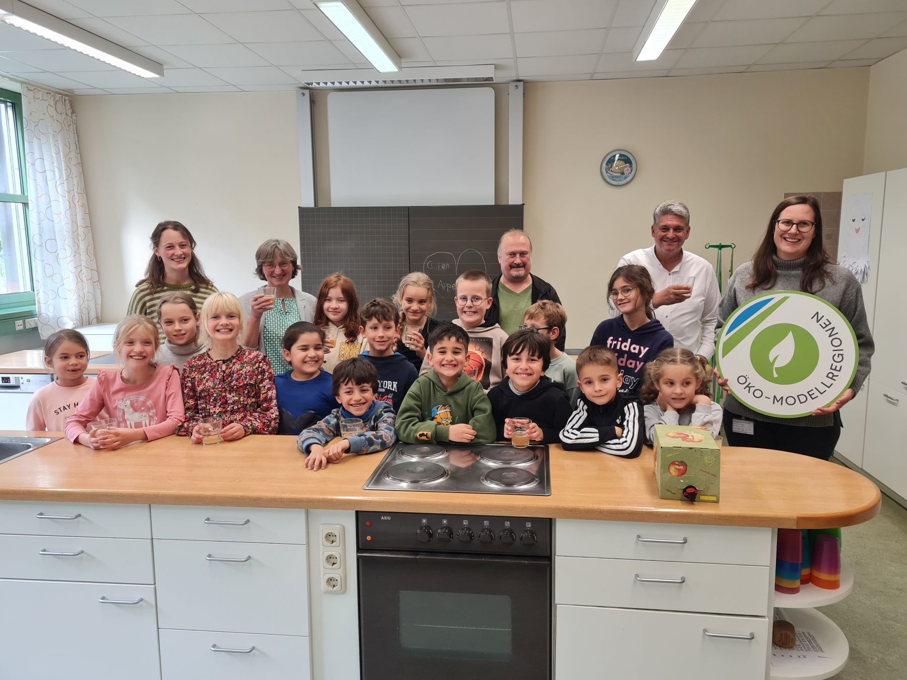 Neufahrns Bürgermeister Peter Forstner (2.v.r.) zusammen mit der Projektgruppe Streuobst um Öko-Modellregions-Managerin Veronika Stanglmayr (rechts) und Kindern der Grundschule Neufahrn.