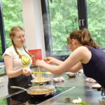 Das kann vorweggeschickt werden, das Essen hatte Sterne-Niveau! Die Zusammenstellung war kreativ und die fünf Gänge passten perfekt zusammen. Jeder Gang hatte in sich außergewöhnliche Ingredienzien, wie zum Beispiel bei der grünen Erbsensuppe (1. Gang) ein Herz aus geschäumtem Sauerampfer. Die Zutaten der weiteren Gänge bargen Komponenten aus der internationalen Küche, wie Bohnenhummus zum grünen Spargelsalat mit Forelle (3. Gang). Auch das Ambiente erinnerte an ein Sterne-Restaurant, die lange Tafel war festlich gedeckt mit liebevollen kleinen Details, das Essen wurde von den Schülern mit Teller-Hauben serviert, die gleichzeitig abgehoben wurden mit Ansage von dem Schüler, der für dieses Gericht verantwortlich war. Die Schüler Felix und Linus bedienten die Gäste während des Essens mit Getränken.
