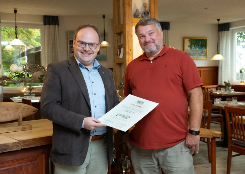 Bericht: Prien Marketing GmbH – Das Restaurant „Zum Fischer am See“, Harrasser Straße 145, erhält für seine regionalen Fischspezialitäten das Qualitätssiegel „Ausgezeichnete Bayerische Küche“. Der Erste Bürgermeister der Marktgemeinde Prien a. Chiemsee Andreas Friedrich (im Bild links) gratuliert dem Inhaber Oliver Leyk: „Ihr Familienbetrieb ist ein Aushängeschild für unseren Genussort Prien – herzlichen Dank für Ihr bereicherndes kulinarisches Angebot.“