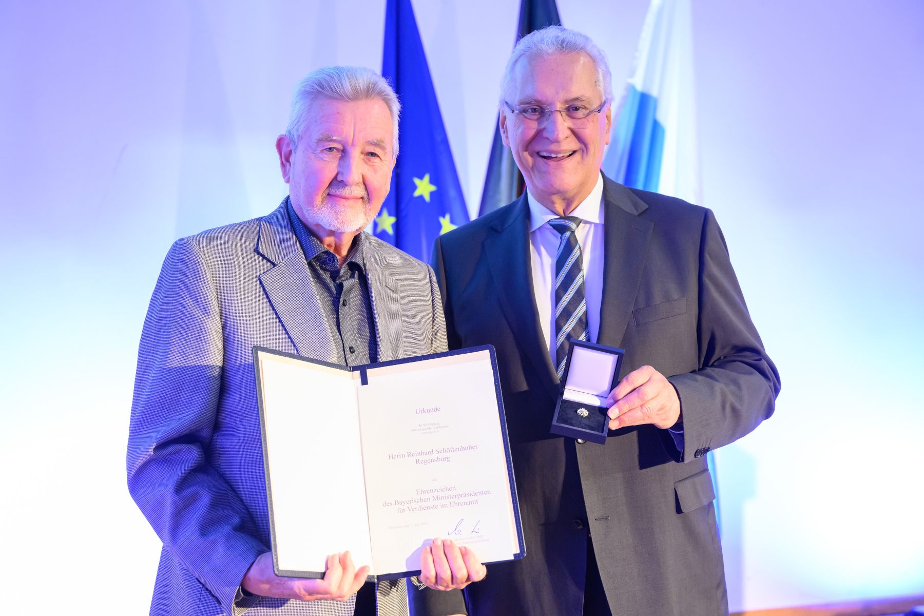 Aushändigung der Ehrenzeichen mit Innenminister Joachim Herrmann (r) für Reinhard Schöftenhuber im Aufseßsaal des Germanischen Nationalmuseums für Verdienste im Ehrenamt, aufgenommen am 31.10.2025 in Nürnberg.Foto: Timm Schamberger / Bayerische Staatskanzlei