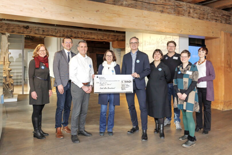 Bericht und Foto: Stadt Regensburg / Christian Kaister – Oberbürgermeisterin Getrud Maltz-Schwarzfischer und Sandra Schneider vom Hauptamt der Stadt Regensburg freuen sich über die Spende, die von Kulturreferent Wolfgang Dersch, Lorenz Baibl, Leiter des Amtes für kulturelles Erbe, Welterbekoordinator Dr. Matthias Ripp und dem Team des Besucherzentrums Welterbe, Susanne Niederleitner, Bernhard Segerer und Gabi Stiglmeier sowie der Projektleitung Janina Rummel übergeben wurde.