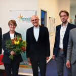 BEricht und Bilder: Renovabis / Matthias Dörr – An einem Strang ziehen die Hilfswerke Misereor und Renovabis künftig in Berlin noch mehr als bisher. Im Rahmen ihrer weltkirchlichen Zusammenarbeit knüpfen die beiden Solidaritätsaktionen der katholischen Kirche in Deutschland am Regierungssitz am Netz der Kooperationspartner mit in- und ausländischen Interessensverbänden und internationalen Staatenvertretungen. Unser Bild zeigt Renate Krekeler-Koch, die Leiterin der neuen Renovabis- Repräsentanz, dahinter Kooperationspartner Jonas Wipfler, den Leiter des benachbarten Misereor-Büros, Renovabis-Aktionsrats-Vize Marc Frings vom Zentralkomitee der deutschen Katholiken (vorne) und Pfarrer Professor Thomas Schwartz, den Leiter des Hilfswerks Renovabis (hinten).