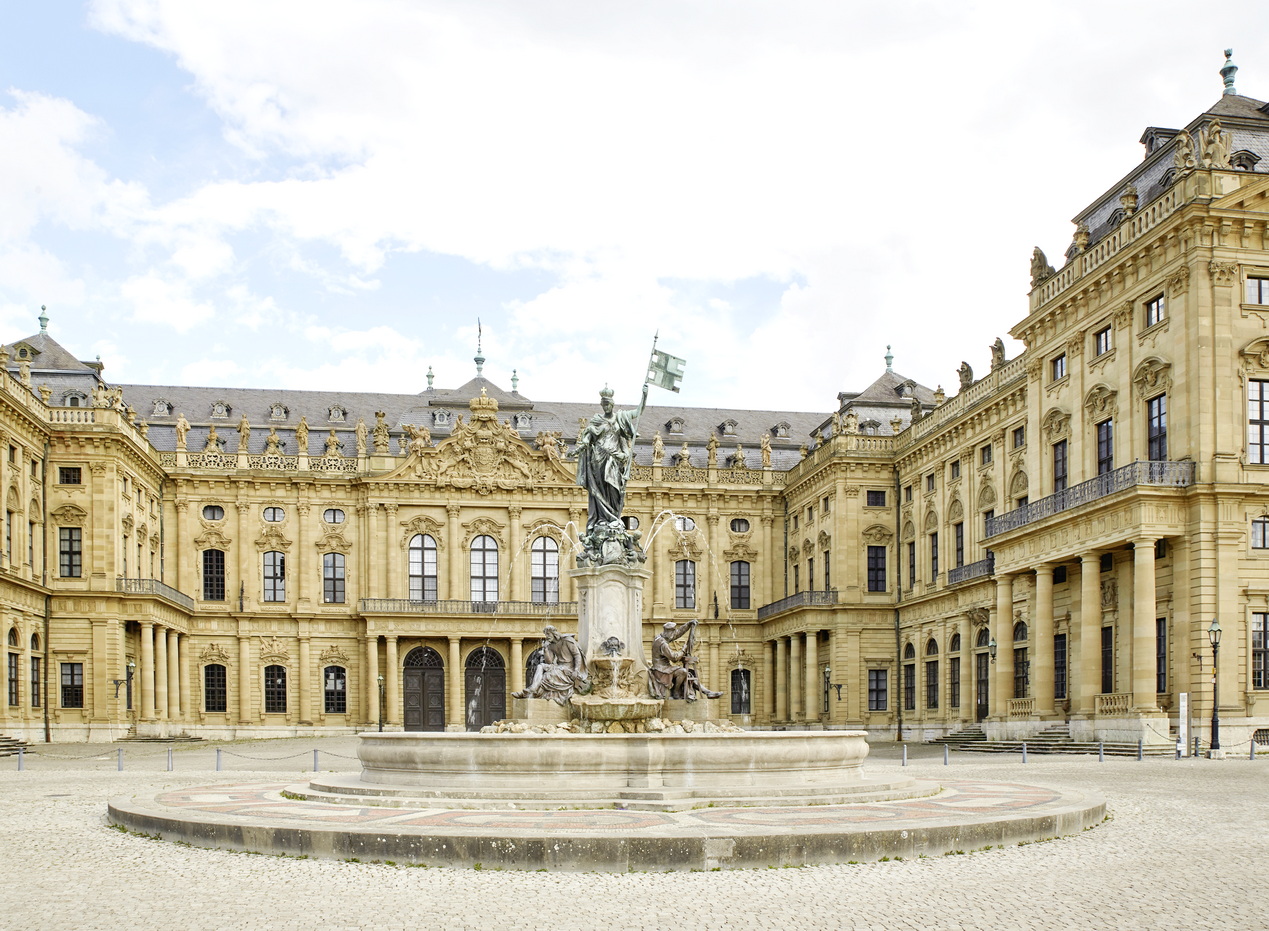 Würzburg, Residenz, Ehrenhof mit Frankoniabrunnen von Ferdinand von Miller, 1894 (Zustand nach der Restaurierung, August 2022)