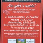 Der Waldgasthof Schöberl steht im Mittelpunkt des heurigen Weihnachtsteaters von der Theatergruppe des Trachtenvereins Riedering. Premiere des bayerischen Lustspiels in drei Akten von Manfred Mayer mit dem Titel “Do geht´s weida” ist am zweiten Weihnachtsfeiertag, 26. Dezember ab 20 Uhr in der Mehrzweckhalle von Riedering.