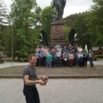 Nach zwei intensiven, hochinteressanten „Lehrstunden“ über die Glockengießerei ging es zum Bergisel und gut 40 m hinauf auf den Schanzenturm. Wer schon einmal die Übertragung der Vier-Schanzen-Tournee gesehen hat, kennt den Blick vom Bakken über den Anlauf hinunter nach Innsbruck, bei dem man meint, die Skispringer würden mitten in der Altstadt landen. Viel fehlt dazu auch nicht. Noch ein Stockwerk höher als der Bakken liegt die große Panorama-Terrasse, von der aus sich rundum ein schöner Ausblick bot – hinüber zum Patscherkofel sowie die Nordkette des Karwendels und das Wipptal hinauf Richtung Brenner. Weil die Bergisel-Schanze mit Matten belegt ist, kann sie auch im Sommer benutzt werden und so konnten die Besucher gerade noch einen Springer bei seinem letzten Trainingssprung für diesen Tag beobachten. Bergisel – der Name steht aber auch für ein dunkles Kapitel der bayrisch-tiroler Beziehungen, die Tiroler Freiheitskämpfe unter der Führung von Andreas Hofer, die 1809 zu den vier Schlachten am Bergisel führten. Glücklicherweise sind diese kriegerischen Zeiten längst Geschichte und so konnte sich die Gruppe vor der Heimreise noch am Andreas-Hofer-Denkmal zu einem Erinnerungsfoto zusammenstellen.