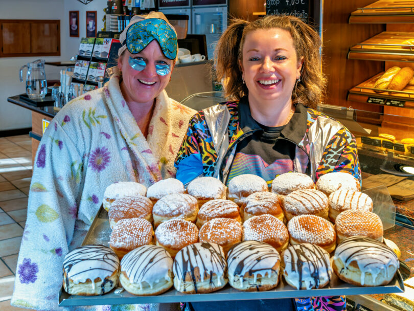 Kurz: Dienstbeginn im Wellness-Modus – nur dass hier statt Gurkenscheiben die Krapfen die Hauptrolle spielen. Und die hatten es in sich. Während die Kaffeemaschine brummte und die Auslage goldgelb leuchtete, präsentierte Kerstin Schlosser das Rosenmontags-Argument schlechthin: ein Tablett voll Faschingskrapfen, geschniegelt mit Puderzucker, Zuckerschnee und Zuckerguss – manche sogar mit feiner Schokodrizzle, als hätte der Fasching persönlich unterschrieben. Wer da „nur schnell“ reingehen wollte, hatte verloren. (Oder gewonnen – je nach Blick auf die Waage.) Die Kundschaft bekam jedenfalls nicht bloß Backwaren, sondern auch beste Laune serviert: ein breites Grinsen hinter der Theke, ein Augenzwinkern dazu und die stille Botschaft, dass man den Alltag ruhig mal im Bademantel abholen darf – solange der Krapfen stimmt. Rosenmontag eben: nicht geschniegelt, aber glücklich.