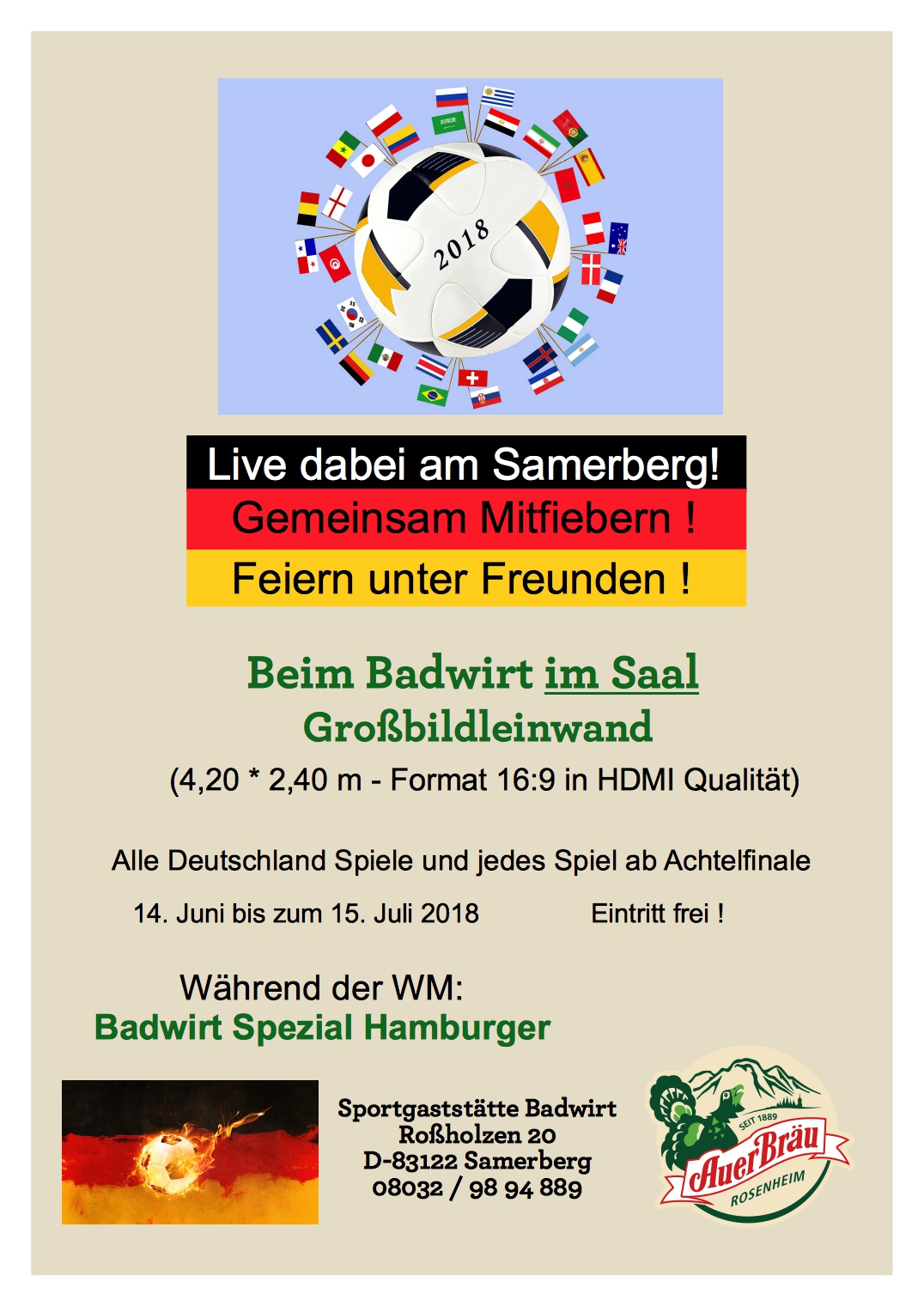 Beim Badwirt in Rossholzen am Samerberg werden alle Deutschland-Spiele und jedes Spiel ab dem Achtelfinale anlässlich der Fußball-Weltmeisterschaft auf Großbildleinwand übertragen. Der Eintritt zum Public Viewing ist frei.
