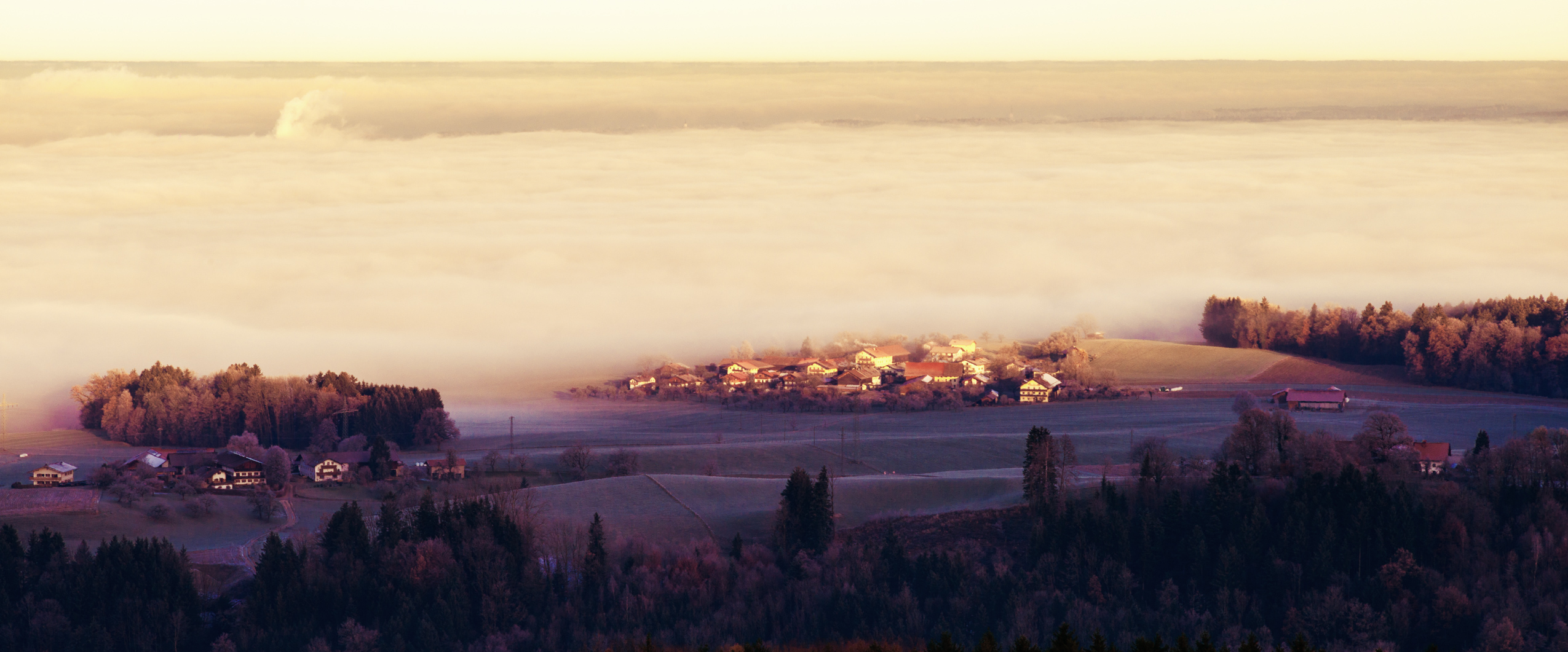 Blick vom Samerberg ins Rosenheimer Land bei Sonnenaufgang. Der Föhn setzt sich durch und drückt die Nebelwand Richtung Norden: Apfelkam liegt schon frei. Das Rosenheimer Land liegt noch im dichten Nebel.