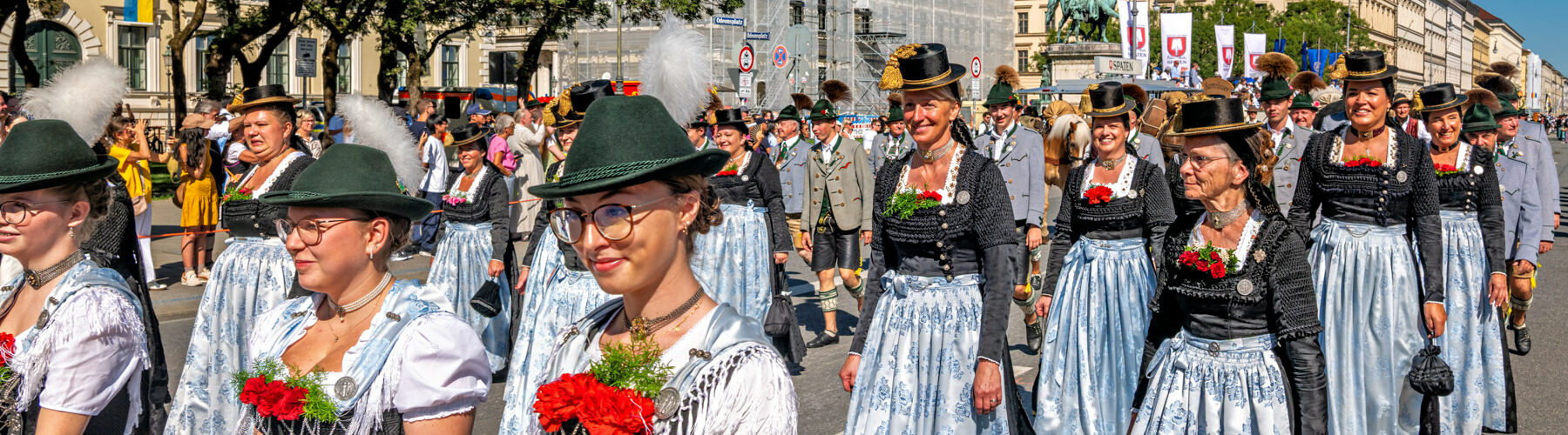 Was den Münchner Oktoberfestzug so einzigartig macht, ist seine Vielfalt: Während bei den bayerischen Gaufesten meist nur die Trachten einer Region zu sehen sind, präsentiert sich in München ein Querschnitt durch ganz Bayern – von der Dachauer Tracht, auch Ludwig-Thoma-Tracht genannt, über das Münchner Biedermeier-Gwand bis hin zu vielen regionalen Besonderheiten.