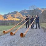 Beschaulicher Jahreswechsel in Aschau: Bei untergehender Sonne haben die Kirchenglocken der katholischen Pfarrkirche Darstellung des Herrn geläutet, dazu haben die drei Aschauer Alphornbläser begonnen vor dem Stadel vom Oberweidachjörg am Bankerlweg ihre besonderen Musikinstrumente erklingen zu lassen. Hans Bauer, Erich Gawlik und Anderl Pertl (von links) schenkten mit ihren Klängen viel Freude zum Jahreswechsel am Fuße der Kampenwand. Viele Bürger und Gäste sind gekommen um den Ständchen zu lauschen.
