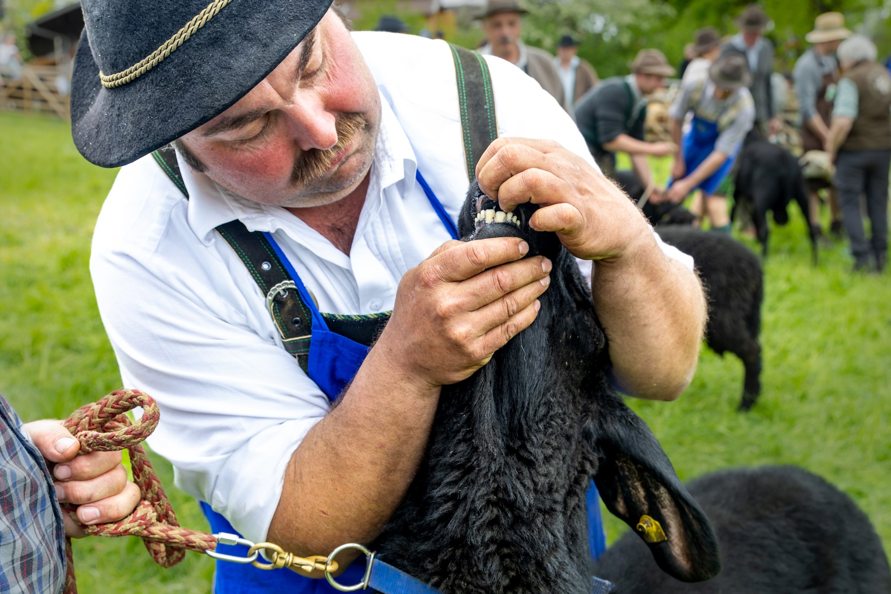 Wolle, Bemuskelung, Stand und Gebiss: Bei der Begutachtung der Tiere für die Prämierung werden die Schafe komplett unter die Lupe genommen. Bildquelle: Bezirk Oberbayern, FLM Glentleiten, Foto: Sauer.