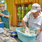 Altbürgermeister Fritz Irlacher und Hias Gasteiger hatten das Roggen- und Weizenmehl in größeren Mengen mitgebracht und beide weihten die Besucher in die Geheimnisse des Brotbackens ein. „Es braucht für ein gutes Brot nur drei Zutaten, Mehl, Wasser und Salz“ erklärte Fritz Irlacher. Aber die Seele ist der Sauerteig, der in einem kleinen Stück im Kühlschrank warten kann, bis das nächste Brot gebacken wird. Für dieses Anstellgut hatten die Besucher leere Glasgefäße mitgebracht, um zuhause das Gelernte in die Tat umzusetzen.
