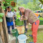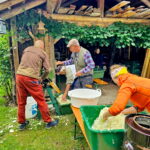Zehn Mitglieder des Vereins haben die Kohlköpfte gewaschen, die äußeren Blätter entfernt und mit vereinten Kräften an den Hobeln zerkleinert. Mit Gewürzen versehen, wurde das gehobelte Kraut in die Krauttöpfe verteilt. Jetzt tut die Natur ihr Werk, damit das fertige Kraut zum Sauerkrautfest angeboten werden kann.