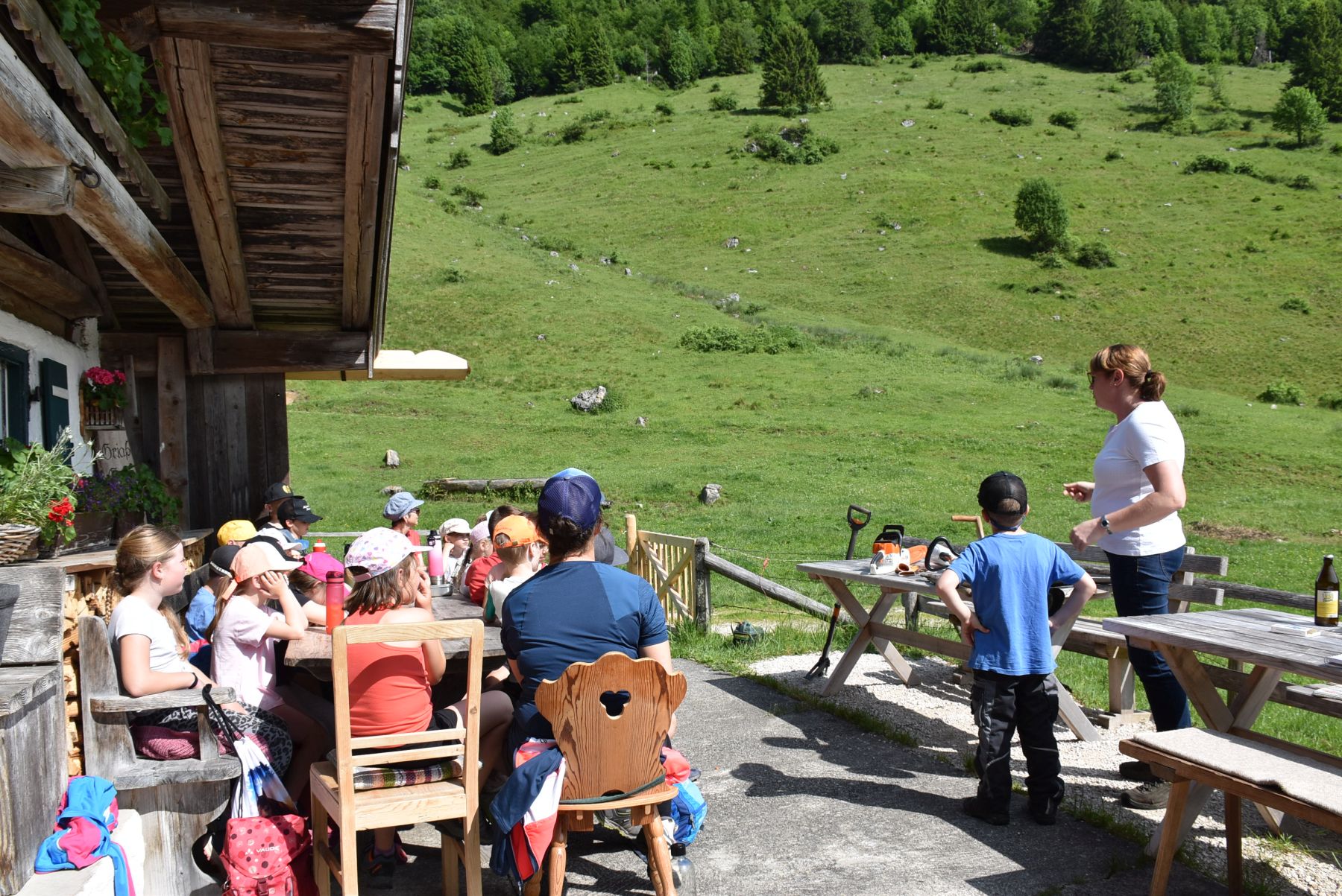 Maria König (rechts stehend) erklärt den Schülern der 1.+2. Klasse die Geräte, die zum schwenden gebraucht werden