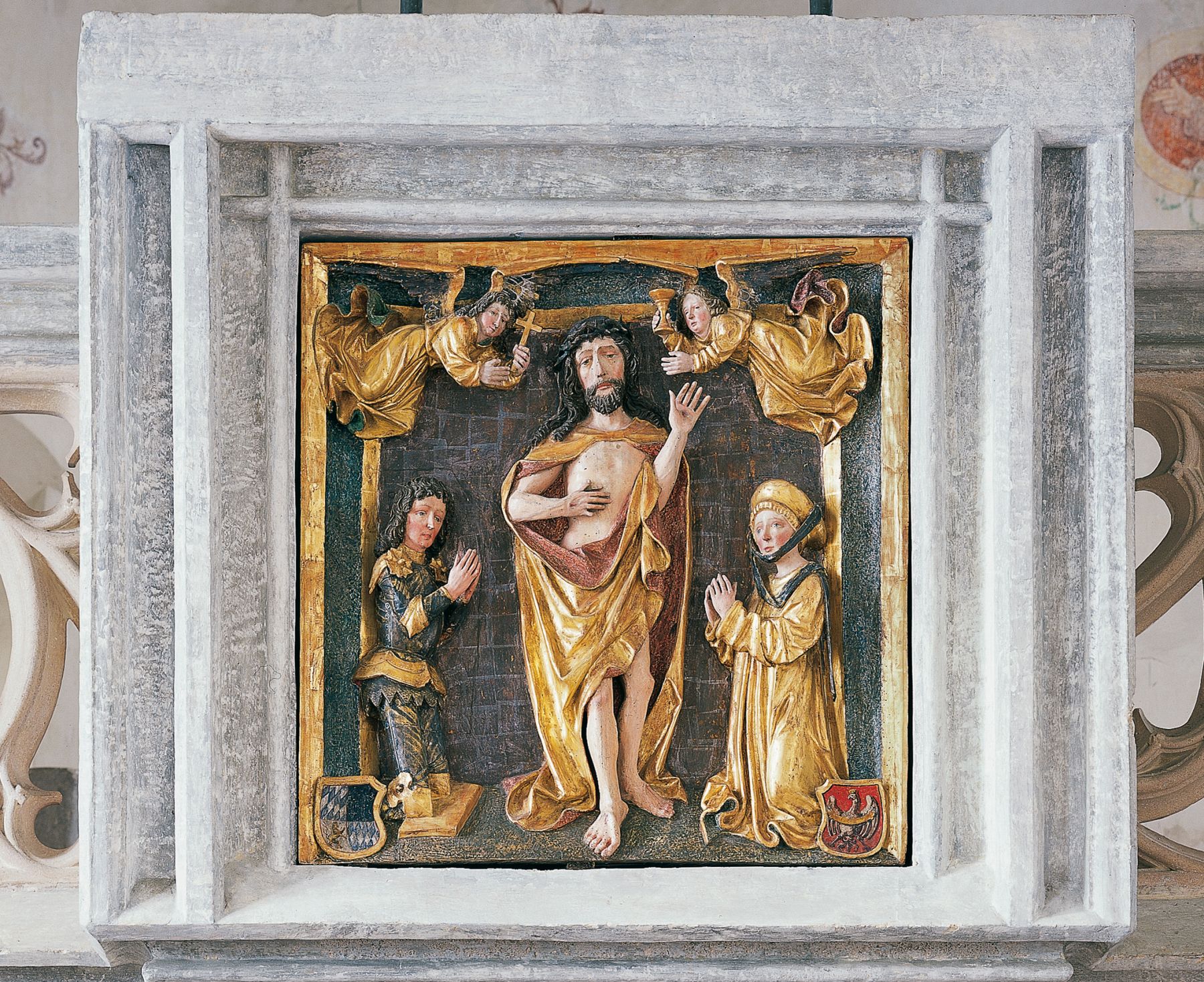 Das Stifterrelief in der äußeren Burgkapelle zeigt Herzogin Hedwig. Unter ihr erfolgten weitreichende Umbaumaßnahmen auf der Burg. © Bayerische Schlösserverwaltung Foto: Rainer Herrmann / Ulrich Pfeuffer