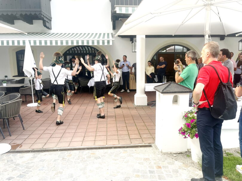 Eine gewünschte Abwechslung zum Seminar- und Beratungsprogramm war das nähere Kennenlernen der bayerischen Lebensart. In diesem Sinne wurden nach einer Chiemseer-Radweg-Runde auf Gut Ising von sechs Buam des Trachtenvereins „Daxenwinkler“ Atzing verschiedene Schlag- und Marschplattler gezeigt. Die entsprechenden Erläuterungen gab in englischer Sprache Jugendleiter Florian Röger, die musikalische Begleitung auf der Ziach übernahm Wasti Jell. Als Dank für Kostprobe und Einblick übergaben die Organisationen dem Trachtenverein für die weitere Jugendarbeit eine Spende.