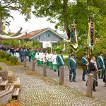 Nach einem feinen musikalischen Einzug zu den Klängen der Musikkapelle unter der Leitung von Wolfgang Haiker, die auch die Messe gestaltete, freute sich Pfarrer Thomas von Rechberg über den schönen Platz für einen Gottesdienst in freier Natur und die vielen festlich gekleideten Menschen. „In der Natur ist man ein Stück näher bei Gott“ gab der geistliche persönliche Erlebnisse preis und nutzte das Evangelium für einen Vergleich mit den Menschen unserer Zeit. „Jeder von uns ist von Gott berufen die Gebote der Schöpfungsordnung einzuhalten, nutzen wir unsere Möglichkeiten, in die Beziehung zu Gott und den Mitmenschen einzutreten“, ermunterte er die Gläubigen und beteuerte: „Frohes Leben und Feiern ist zutiefst menschlich und gehört dazu“. Mit einem Lob für die Trachtenvereine, bei denen Zusammenhalt und Hilfe ein Markenzeichen seien, setzte er den Schlusspunkt unter einen Gottesdienst, bei dem Franz Krammer und Petra Holzner die Lesungen und die Fürbitten vortrugen, und marschierte dann mit seinem Kirchendienst und den Trachtlern durch das Dorf hinauf zum Kirchplatz, wo die beiden Vorstände Sepp Geisreiter und Michael Mader gemeinsam einen Kranz vor dem Kriegerdenkmal ablegten.
