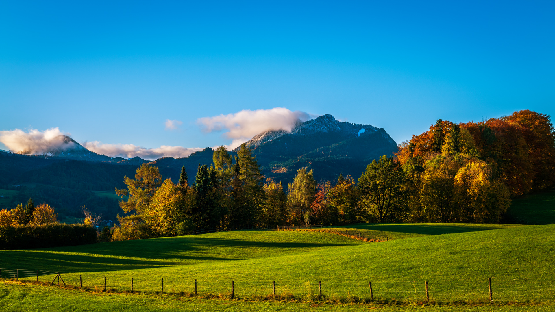 Spätherbstmorgen mit schneebedeckten Gipfeln