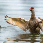 - Die Kolbenente war mit der Gefiederpflege fertig und hat dies mit heftigen Flügelschlagen bekräftigt.