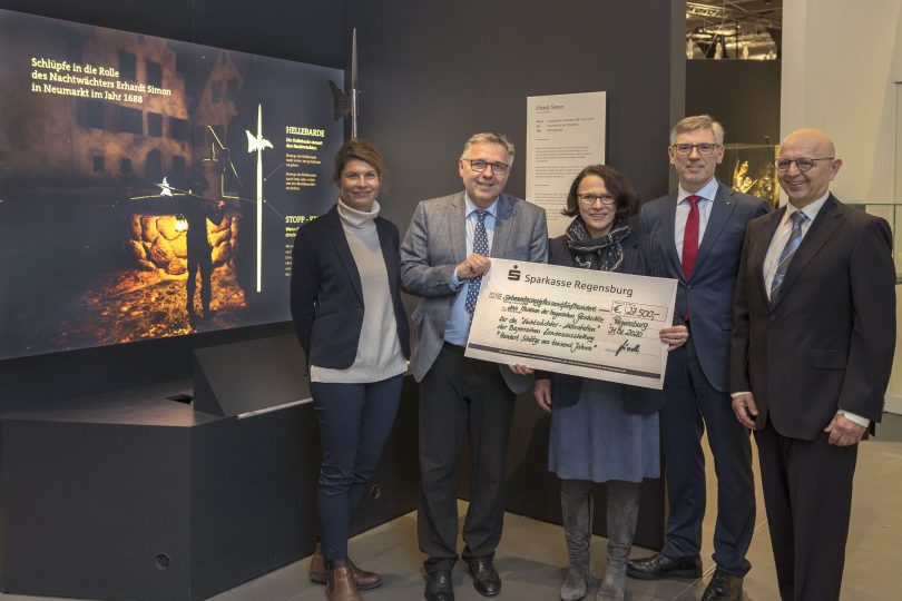 Stadtgeschichte einmal anders zu erleben – das ist das Konzept, das hinter einer innovativen Medienstation zum Thema „Alltag eines Nachtwächters im 17. Jahrhundert“ steckt, die das Haus der Bayerischen Geschichte dank der großzügigen Förderung der Bayerischen Sparkassenstiftung und der Sparkasse Regensburg für die Bayerische Landesausstellung „Hundert Schätze aus tausend Jahren“ entwickeln konnte. Am frühen Freitagnachmittag haben Dr. Ingo Krüger, Stiftungsvorstand der Bayerischen Sparkassenstiftung, Franz Xaver Lindl, Vorstandsvorsitzender der Sparkasse Regensburg und Gertrud Maltz- Schwarzfischer, Verwaltungsratsmitglied der Sparkasse Regensburg und Bürgermeisterin der Stadt, in der Ausstellung symbolisch den Förderscheck an das Haus der Bayerischen Geschichte übergeben. Als Nachtwächter in der Oberpfalz „Bei der Station schlüpfen die Besucherinnen und Besucher in die Rolle eines Nachtwächters“, erläutert Dr. Rainhard Riepertinger, Projektleiter der aktuellen Schau in Regensburg. Als historisches Vorbild dient ein Nachtwächter namens Erhardt Simon, der im späten 17. Jahrhundert in Neumarkt in der Oberpfalz seinen Dienst verrichtete. Mit Hilfe einer nachgebauten Hellebarde, die als Steuerung dient, kann der Besucher gleichsam als Nachtwächter durch das 3D-Modell einer idealtypischen Stadt gehen, die sich an Neumarkt in der Oberpfalz orientiert. „Unser herzlicher Dank gilt den Förderpartnern, ohne die diese Station keine Umsetzung gefunden hätte“, so Riepertinger. Auf seiner Runde durch die nächtlichen Gassen erfüllt der Nachtwächter verschiedene Aufgaben, wie zum Beispiel die Durchsetzung der Sperrstunde oder die Ausschau nach Brandherden. Man begegnet einem Bäcker, ein paar trinkfreudigen Personen oder einem Passanten ohne Licht. Stehenbleiben und eingreifen oder nicht? Dies gilt es zu entscheiden. Die Auflösung kommt sofort und öffnet Fenster in eine heute fremdartig wirkende Zeit vor etwa 350 Jahren. Darüber hinaus erfährt man an verschiedenen Stellen wissenswerte Details über das städtische Leben im 17. Jahrhundert.