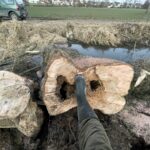 Hinzu kommt, dass Gewässer selbst bei leichten „Kurven“ im Gewässerverlauf im so genannten „Prallufer“ Material abtragen und auf diese Weise Wurzelstöcke freilegen. Auf diese Weise leidet die Wurzelverankerung im Boden nach und nach und irgendwann ist die erforderliche Stabilität nicht mehr gegeben. Die schlichte Konsequenz: der Baum fällt um. Kommt dann, wie im vorliegenden Fall, auch noch eine Stammfäule hinzu, dann beschleunigt sich der Prozess noch deutlich. Es ist also deutlich erkennbar, dass hier der Biber hier seine Finger bzw. Pfoten nicht im Spiel hatte.