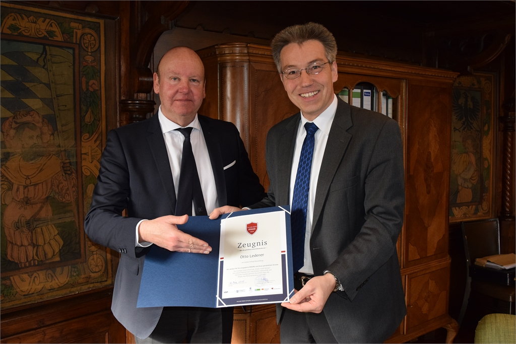 v.l. Der Direktor des Instituts Schloss Brannenburg, Hans Zuber, übergibt dem Landtagsabgeordneten Otto Lederer ein Zeugnis für seinen Unterricht am Tag der Freien Schulen.