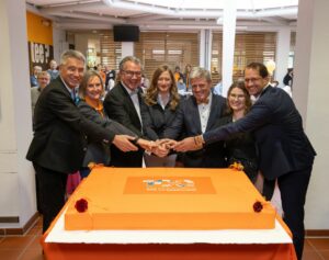 Strahlende Gesichter beim Anschneiden der Geburtstagstorte: Rosenheims Landrat Otto Lederer, Elisabeth Ranzinger als Vertreterin des Personalrats, Hochschulratsvorsitzender Klaus Stöttner, Professorin Nicole Strübbe als Vertreterin der Fakultäten, Hochschulpräsident Professor Heinrich Köster, Leonie Wintersperger als Vertreterin der Studierenden und Rosenheims Oberbürgermeister Andreas März. Bild: Ilona Stelzl