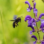 Bienenfreundliche Pflanzen wie Phacelia und Wiesen-Salbei werden gerne durch Wildbienen besucht. Links: Ackerhummel auf Phacelia (Foto: privat). Rechts: Holzbiene im Anflug auf einen Wiesensalbei.