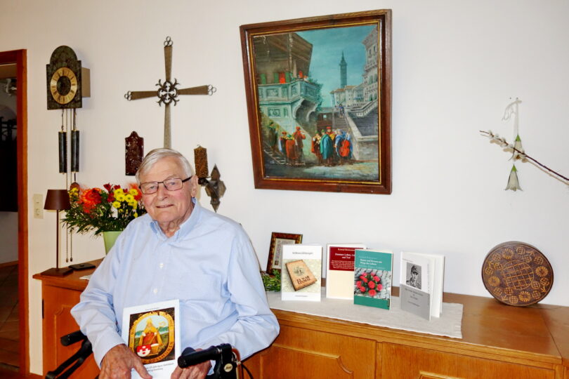 Foto: Hötzelsperger – 1. Konrad Breitrainer  – in seinem Wohnzimmer mit einem Gemälde seines Vaters Johann Breitrainer aus dem Jahr 1946 (Kopie des Werkes „Das Ständchen“ von Carl Spitzweg).