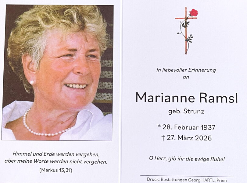 Im Alter von 89 Jahren verstarb nach langer Krankheit und Jahren guter Pflege Daheim Marianne Ramsl aus Rain bei Wildenwart. Marianne Ramsl, geborene Strunz kam im Februar 1937 in Fürstenhut im Böhmerwald zur Welt und lebte dort, bis sie 1945 mit ihrer Familie vertrieben wurde.