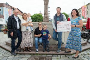 Sie freuten sich über die Unterstützung durch die Aktion „…die im Dunkeln sieht man nicht“ mit einer Spende von 5.000 Euro (von links): Heinz und Waltraud Konarski (mit dem keinen Matthias), Claudia Schaffner-Konarski mit JoJo, Thomas Konarski mit Schirmherrin Veronika Hümmer.