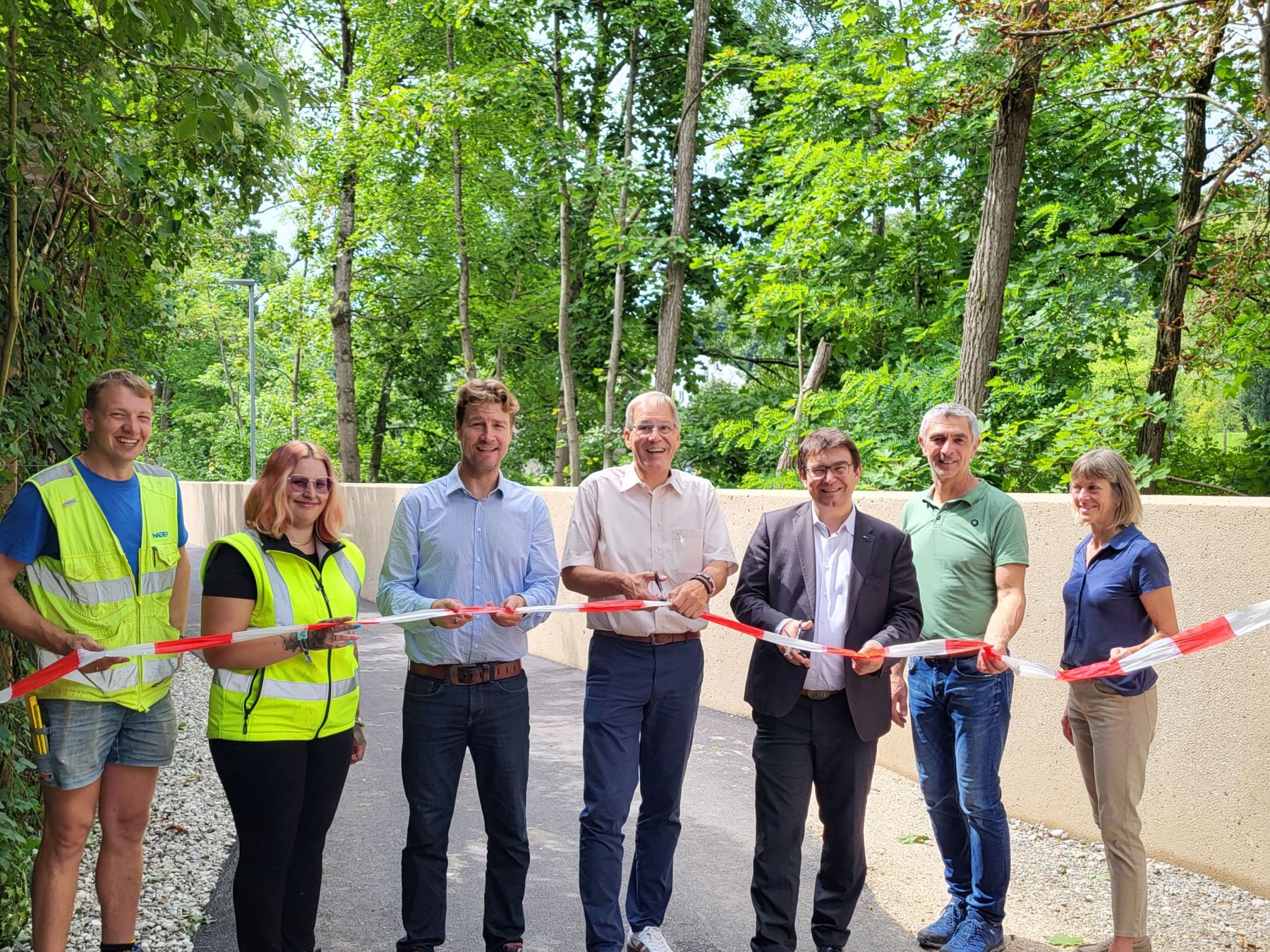 Trostbergs Bürgermeister Karl Schleid (Vierter v.l.) durchschneidet das Absperrband, gemeinsam mit Bernhard Lederer, dem Leiter des Traunsteiner Wasserwirtschaftsamtes (Fünfter v.l.). An der Wiedereröffnung des Fuß- und Radweges nahmen zudem teil (v.l.): Polier Michael Grebien; Bauleiterin Jaqueline Kröll; Bauleiter Tobias Nöring; Gerhard Kühnhauser vom Wasserwirtschaftsamt Traunstein sowie Astrid Thamm, die Leitern der Tiefbau-Abteilung im Bauamt der Stadt Trostberg. Foto: Wasserwirtschaftsamt Traunstein