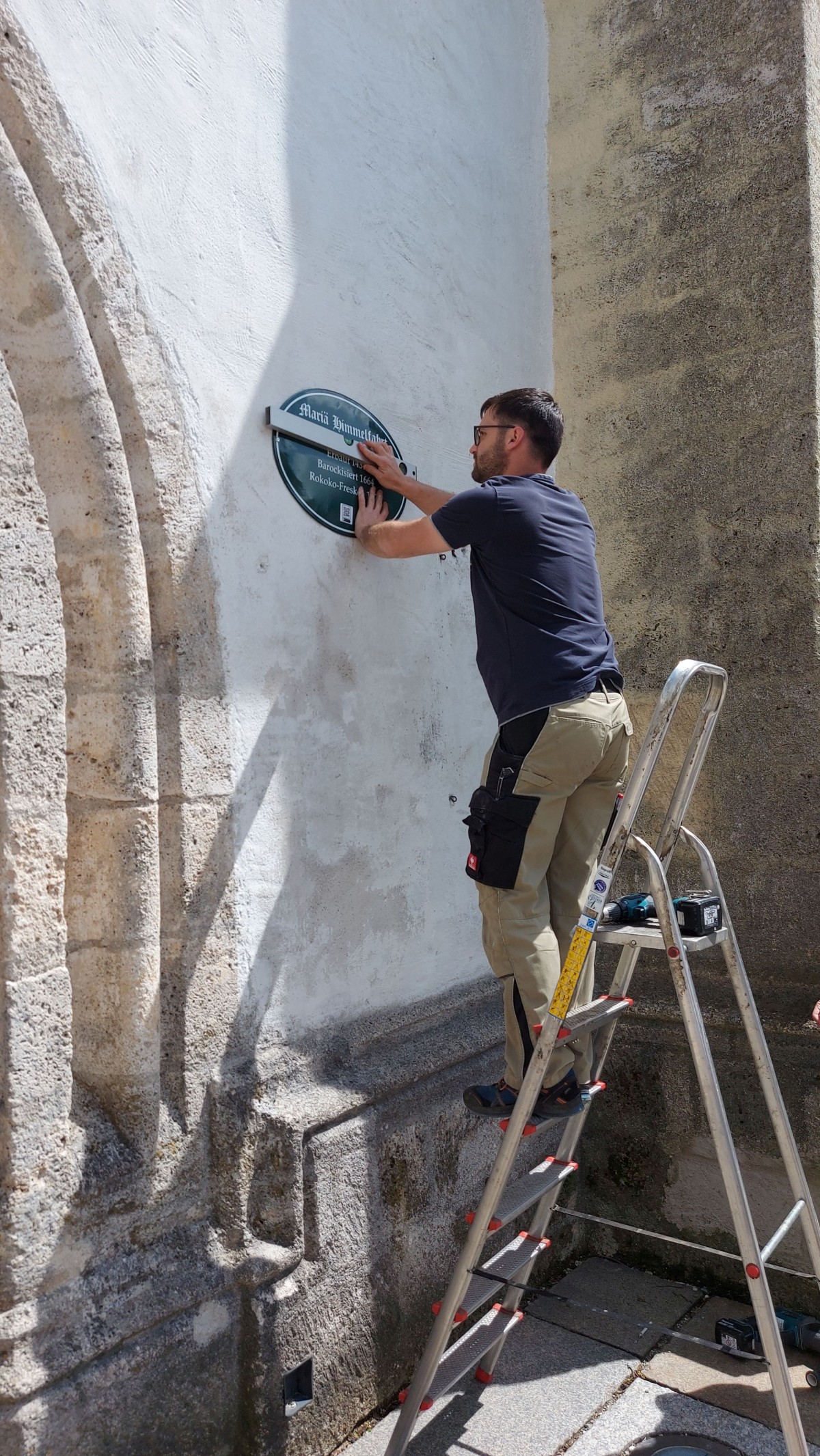 Thomas Poschner beim Anbringen der ersten Tafel an der Schnaitseer Pfarrkirche. Foto: LAG Chiemgauer-Seenplatte
