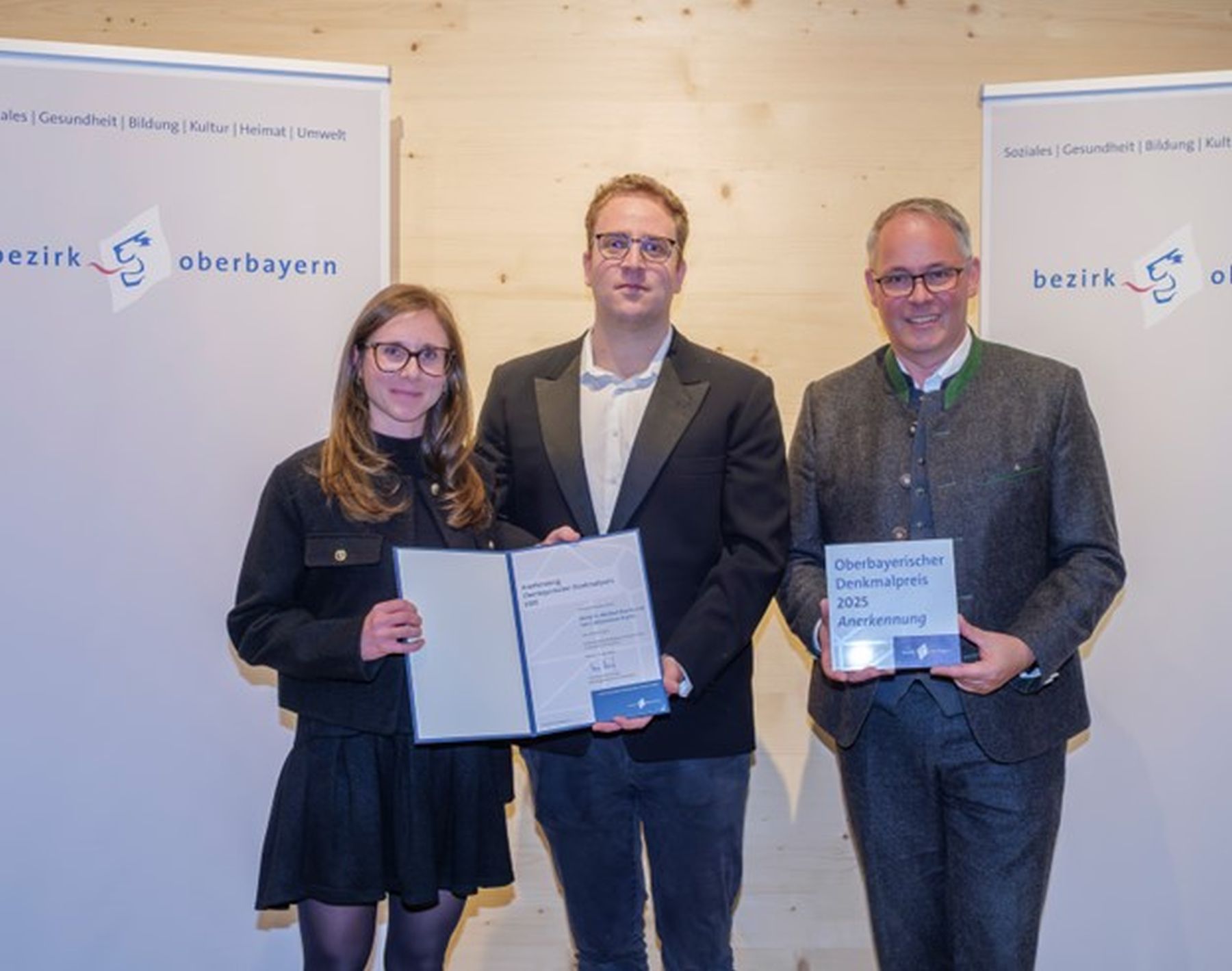 Freilichtmuseum Amerang des Bezirks Oberbayern: Thomas Schwarzenberger (rechts) verleiht eine Anerkennung zum Oberbayerischen Denkmalpreis 2025 an Dr. Michael und Maximilian Bracht. Die Urkunden nehmen stellvertretend Laura und Constantin Bracht, Kinder von Dr. Michael Bracht, entgegen. (Foto: © Bezirk Oberbayern/Wolfgang Englmaier)