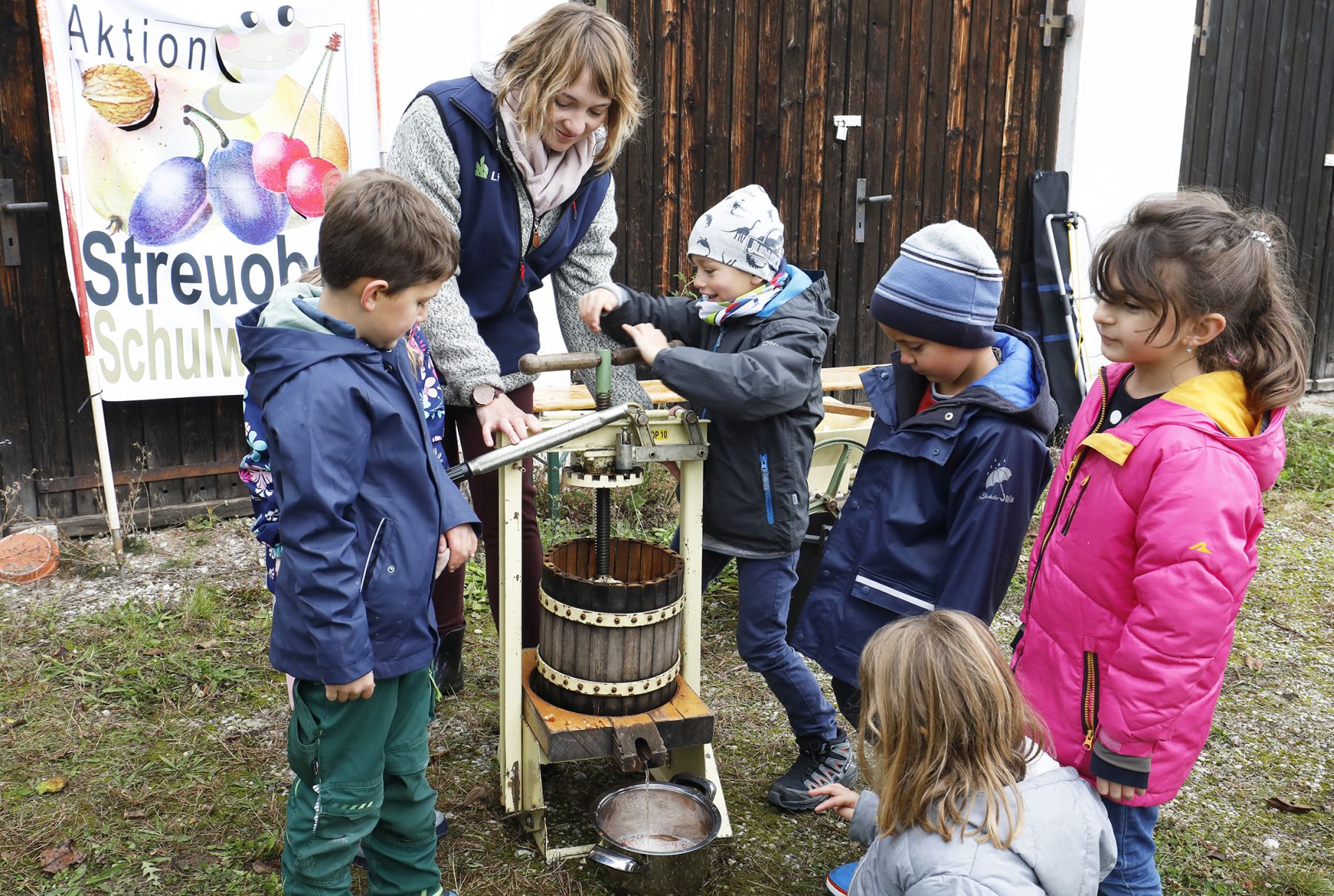 Äpfel pressen macht Spaß: Kinder bei einer Streuobst-Schulwoche an der Presse (Foto: Birgit Gleixner, LfL)