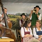 Die aus dem Rottal stammende Vilsleit’n Musi wartete mit einem heute selten gewordenen Bandoneon im Wechsel mit einer Gitarre, einer Harfe und einer steirischen Ziach auf und interpretierte gekonnt bekannte und unbekanntere Stücke. Den aus dem südlichen Landkreis Ebersberg kommenden Oimbliah Dreigsang verbindet nicht nur eine lange Freundschaft, sondern auch die Liebe zur Volksmusik. Sie legen viel Herzblut in ihre besonderen Lieder, die sie zum Großteil selbst schreiben, so die Sprecherin. Der Herbst kam mit dem Dreigsang in den Saal mit „Braune Wies, nosse Steigal“ und „Da Nebe ziahgt eina“. „Musikanten des woaß i“, „De Liab is a lange Roas“ und „Da Dog gibt sei Leuchtn auf“ komplettierten, von zwei Gitarren begleitet, den bunten Strauß an Liedern. Beschwingt begann die Familienmusik Ernst mit dem aus Musik und Gesang bestehenden Stück „Es ist schön, bei Euch zu sein“. Bei der in Schwindkirchen beheimateten musikalischen Familie spielen die beiden Elternteile, zwei Töchter und zwei Söhne Trompete, Akkordeon, Geige, Kontrabass, Basstrompete, Klarinette und Posaune und verstehen es ausgezeichnet, bodenständige Musik schmissig darzubieten. Beim Duschlhof G’sang, zwei Frauen und zwei Männer aus dem Rottal, ebenfalls familiär verbunden und diesmal allerdings mit einer Aushilfe, hieß es harmonisch und mit nicht oft gehörten Liedern „A guats Jahr is boid wieder umma“, „D‘ Arndt is eibrocht“, „Vom Häusl am Roa“, „Im Wirtshaus is lustig“ und „Oa Hoibe Bier, zwoa Hoibe Bier“.