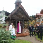 Der Vorsitzende des Veteranen- und Kriegervereins Wildenwart Florian Bauer an der Wildenwarter Gedächtniskapelle, links Diakon Michael Leberle rechts die beiden Bürgermeister von Frasdorf Josef Prankl und Prien Andreas Friedrich.