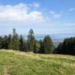 Wir starten in Adersberg, wo ein schöner Höhenrundweg beginnt. Am Wanderparkplatz bei dem Berggasthof steht erst ein einziges Auto und auch auf dem gesamten Rundweg begegnet uns nur eine Handvoll Wanderer und zwei Mountainbiker. Von Adersberg gehen wir anfangs steil, später etwas moderater bergauf. Der Weg ist aussichtsreich, bald gibt es schöne Ausblicke auf den Chiemsee. Wir kommen zu einer Bank mit grandiosem Blick in die Berge, greifbar nah die Gedererwand und die Kampenwand. Wir nehmen sie in Beschlag und genießen eine Weile die Ruhe und die schöne Landschaft.