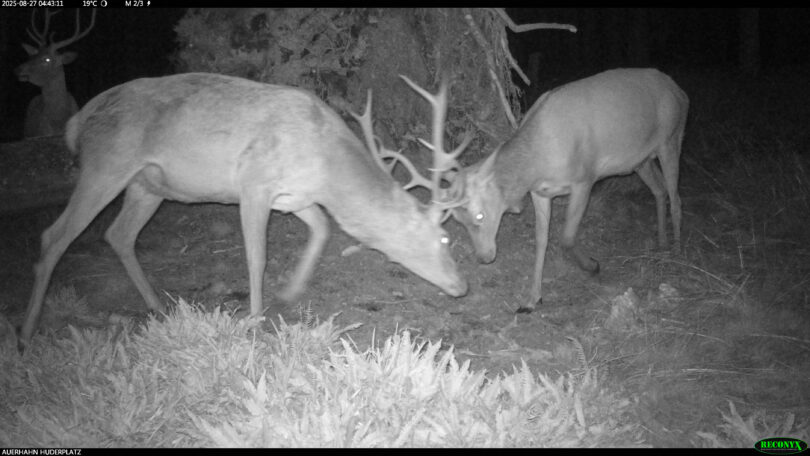Zu den mitunter häufigsten Besuchern des Wurzeltellers gehörten Hirsche, erklärt Jörg Müller. „Da auf dieser entstandenen Waldlichtung auch Gräser und Sträucher wachsen, kommen die Tiere zum Fressen und teilweise auch zum Wälzen in der Erde, also zur Fellpflege, dorthin.“ Als Spielwiese nutzte ein Hirschkalb den offenen Bereich und tobte minutenlang um den Wurzelteller herum. Auch für die älteren Artgenossen ist das Areal offenbar sehr attraktiv. So waren im Spätsommer zunehmend auch Hirsche zu beobachten, die die Lichtung als Bühne für ihre beeindruckenden Kämpfe und Imponiergehabe während der Brunft verwendeten.