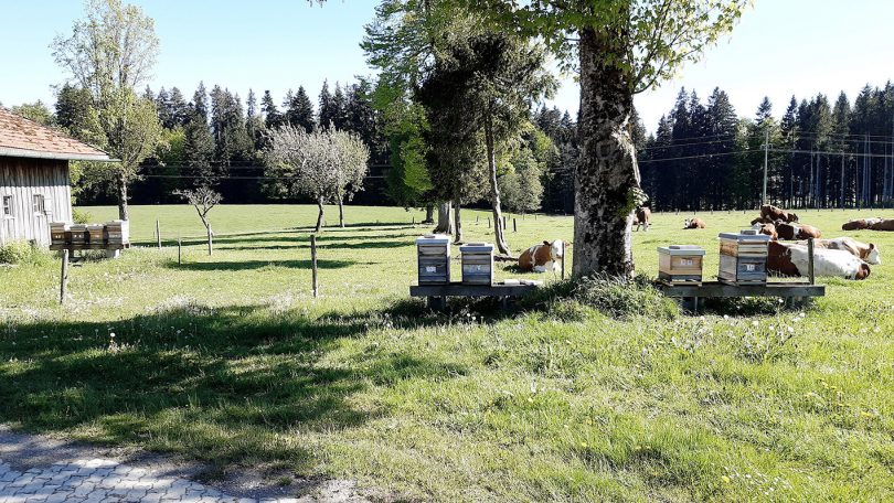Dass Weidehaltung besonders tiergerecht und umweltfreundlich ist, ist bekannt. Doch dass auch Bienen davon profitieren, wissen nur wenige: Grasende Kühe sind wichtige Landschaftspfleger. Sie fördern das Aufkommen von Kräutern und Blühpflanzen und schaffen so die Nahrungsgrundlage für Bienen und andere Insekten. Diese wiederrum sind elementar für Biodiversität und Ernährungssicherheit. Ein Zusammenhang, den die Molkerei Berchtesgadener Land mit ihren 1.700 Landwirten stets im Blick hat. „Wie viele Landwirte hier in der Region zwischen Zugspitze und Watzmann haben auch wir neben der Milchviehhaltung noch einen Obstanger. Dieser bietet gerade im Frühjahr zur Blüte ein vielfältiges Futterangebot für Bienen und Hummeln. Im Umkehrschluss brauchen wir natürlich die kleinen Helfer zur Bestäubung, um überhaupt Obst ernten zu können. In Zeiten von Meldungen über den drastischen Rückgang von Bienen und Insektenpopulationen haben wir überlegt, wie wir Bienen und Insekten noch besser helfen könnten. Daraus ergab sich, dass wir in Zusammenarbeit mit einem Imker neben unseren Milchkühen auch Bienenstöcke auf unserem Betrieb aufgestellt haben“, erzählt Landwirt Johannes Schwabenbauer. Eine Beobachtung, die zahlreiche Studien belegen: Die Bienenpopulation nimmt dramatisch ab. Es gibt dringenden Handlungsbedarf, Bienen zu schützen und ihre Futterquellen zu erhalten – darauf macht unter anderem der seit 2018 jährlich stattfindende Weltbienentag am 20. Mai aufmerksam. Naturnahe Landwirtschaft und Weidehaltung können einen wesentlichen Beitrag dazu leisten, erklärt Schwabenbauer: „Kühe sorgen auf vielfältige Weise für artenreiche Weiden. Ein Beispiel: Dort, wo Kuhfladen auf der Weide sind, grasen die Kühe eine gewisse Zeit nicht. So wachsen an diesen Stellen Gräser und Kräuter. Auf diese Weise können an verschiedenen Stellen über den Sommer verteilt Gräser und Kräuter zur Blüte zu kommen. Außerdem fördert der Kot der Wiederkäuer die Bodenfruchtbarkeit und das Bodenleben. Ein gesunder Boden ist die Basis, um überhaupt einem vielfältigen Gräser- und Kräuterbestand die Grundlage zum Wachsen zu geben.“ Wichtig ist zudem das richtige Mähen, d.h. im Idealfall ohne Mähaufbereiter und zu einer Tageszeit geringer Bienenaktivität. Es wird deutlich: Nur durch eine enge Zusammenarbeit zwischen Landwirten und Imkern kann die biologische Vielfalt erhalten und gefördert werden. Inzwischen haben rund 50 Landwirte der Molkerei Berchtesgadener Land eigene Bienenvölker, viel mehr noch arbeiten – wie auch Johannes Schwabenbauer – mit den Imkern in der Region zusammen.