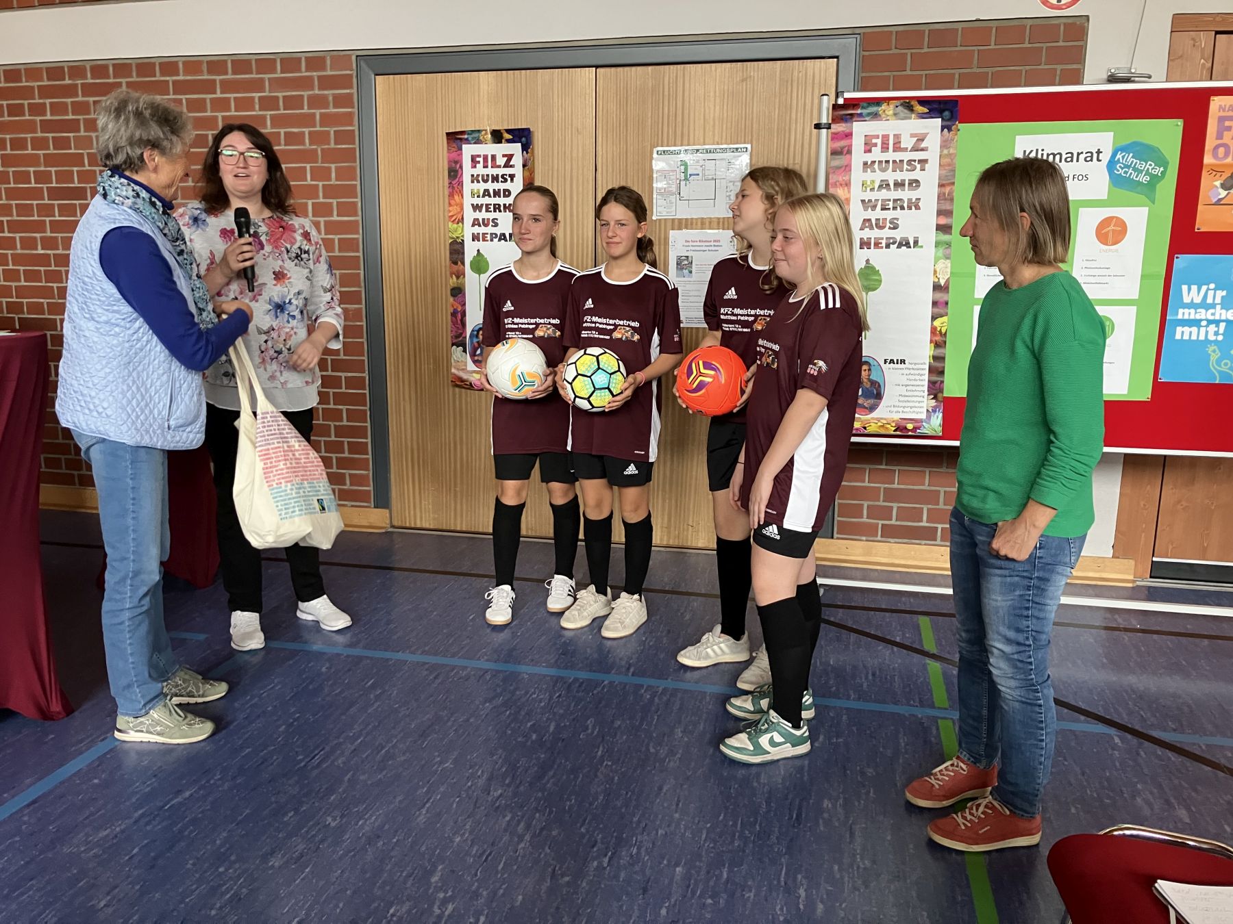 Faire Bälle verteilt Rosi Pscheidl (von links) vom Weltladen Mitterfelden an die Fußballmädels. Die Lehrkräfte Michaela Probst und Susanne Jahn-Wiest engagieren sich für einen fairen Pausenverkauf an der Schule.