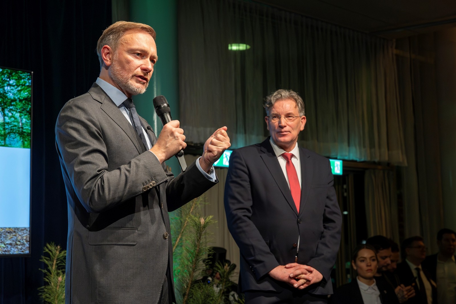 • FDP-Vorsitzender Christian Lindner bei seinem Grußwort mit AGDW-Präsident Prof. Andreas Bitter auf dem Abendempfang der Waldeigentümer