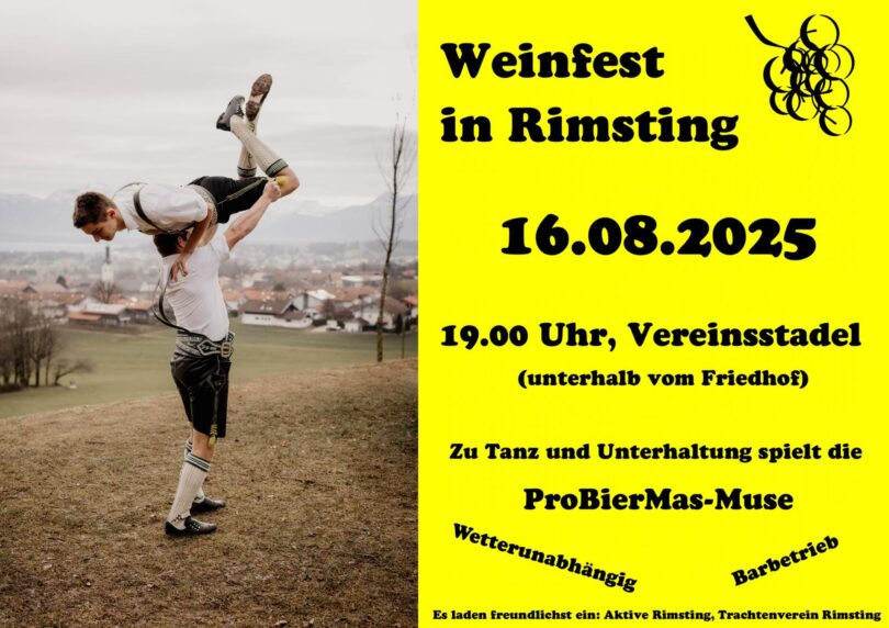 Am Samstag, 16. August lädt der Trachtenverein Rimsting gemeinsam mit den Aktiven des Vereins herzlich zum traditionellen Weinfest ein. Gefeiert wird ab 19 Uhr im Vereinsstadel (unterhalb vom Friedhof).