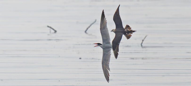 - Eine Schmarotzerraubmöwe versuchte, einer Raubseeschwalbe die Beute abzunehmen, blieb dabei jedoch erfolglos.